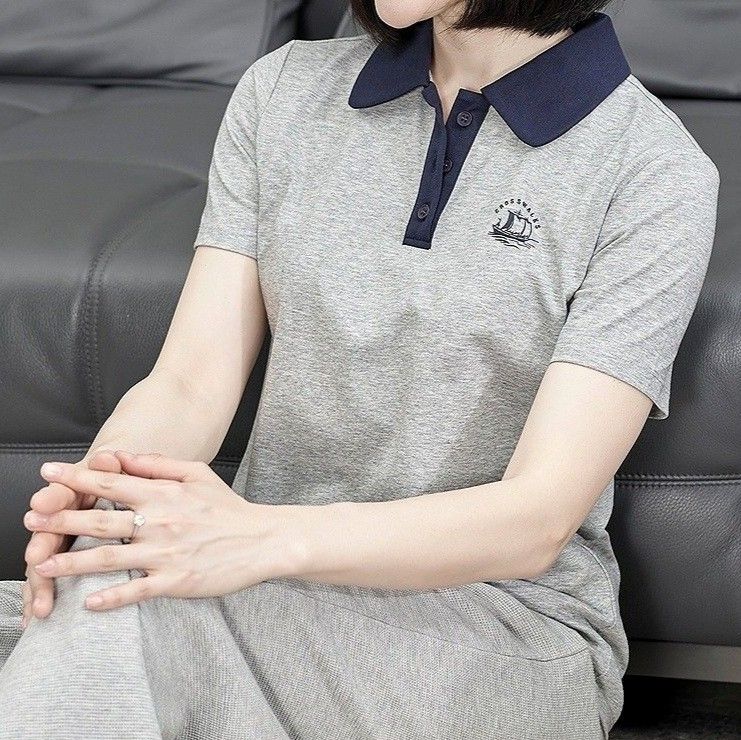襟付きの半袖トップスとして、きちんとした印象を保ちながらも着心地の良さを実現しています。