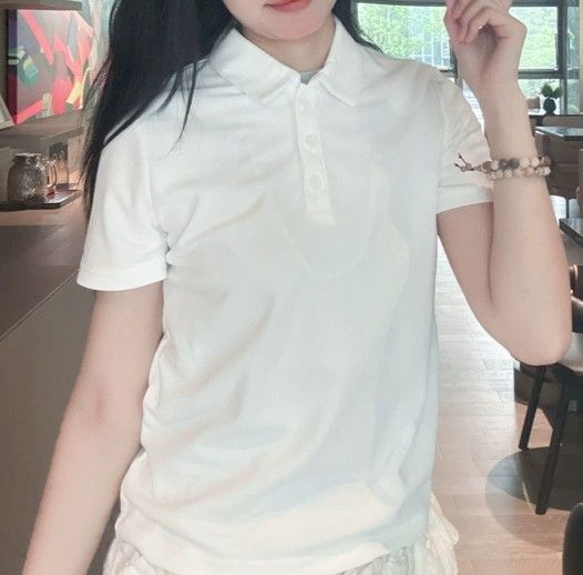 上品な印象を与えるニット素材の白い半袖ポロシャツです。