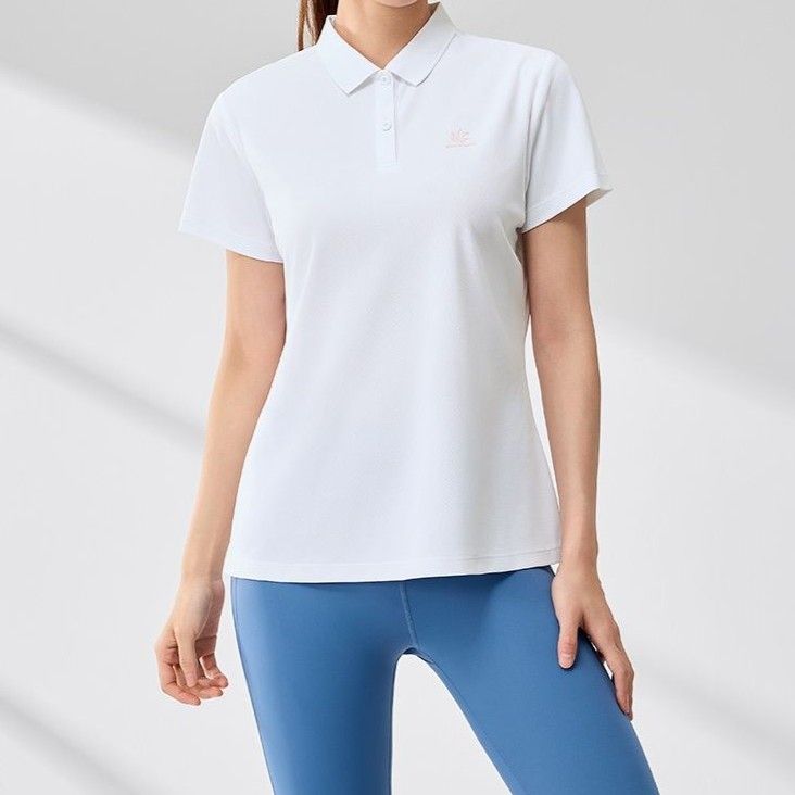 運動シーンにも対応できる、機能性に優れた白の半袖ポロシャツです。