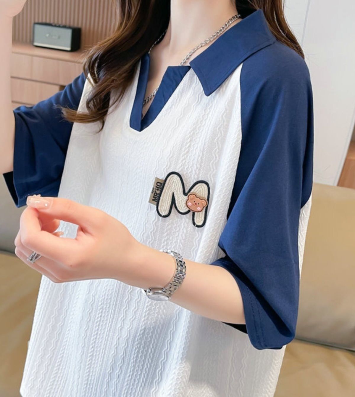 くまワッペンと配色切替がかわいいレディース半袖襟付きポロシャツ