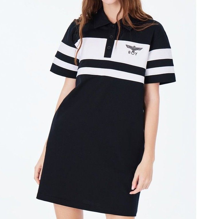 黒と白のコントラストが目を引くデザインで、ポロシャツのカジュアルさとワンピースの女性らしさが見事に調和しています。