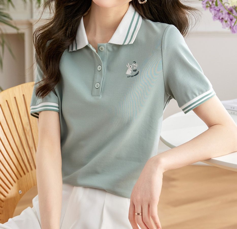 可愛いうさぎ刺繍配色襟のレディースポロシャツ