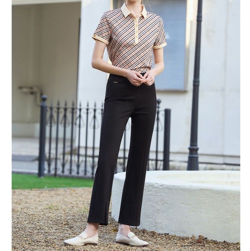 ポロシャツ レディースの定番デザインに格子柄をあしらった半袖ポロシャツです。