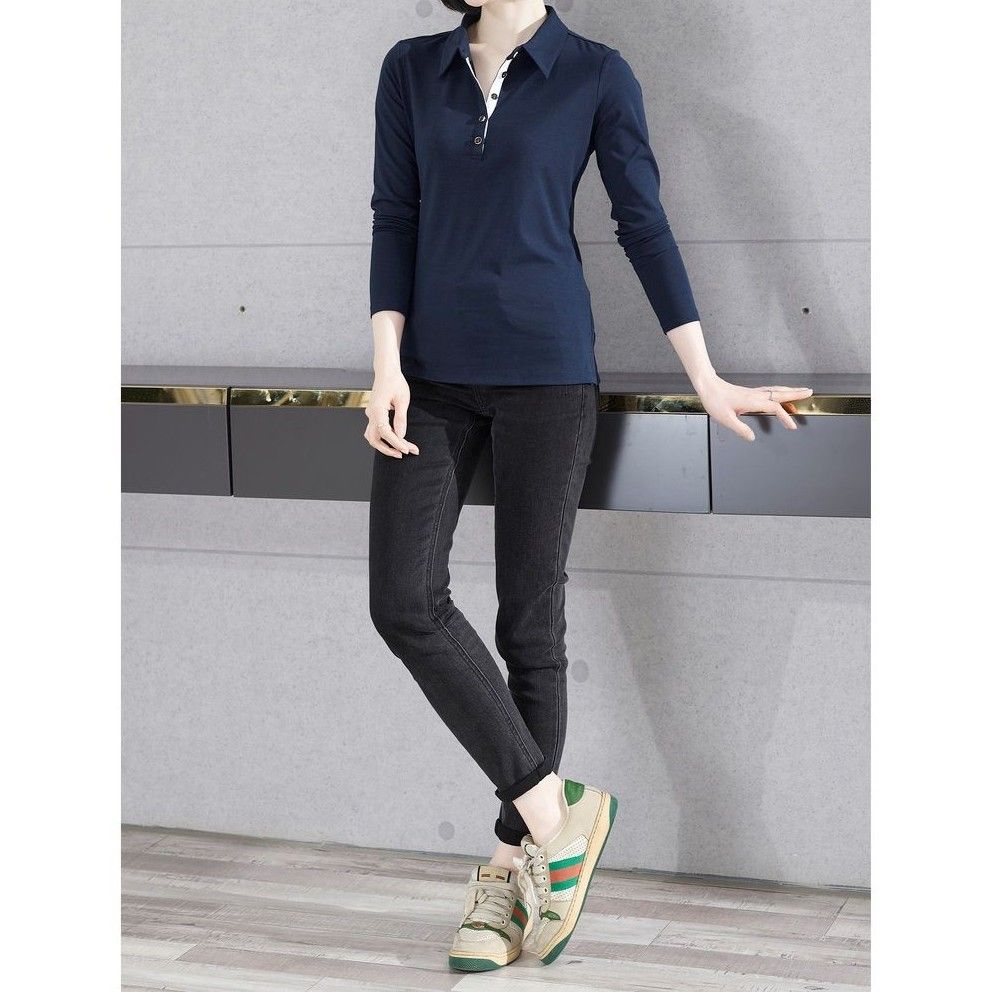 ポロシャツ レディースの定番デザインながら、長袖タイプで季節の変わり目にも活躍する一枚です。
