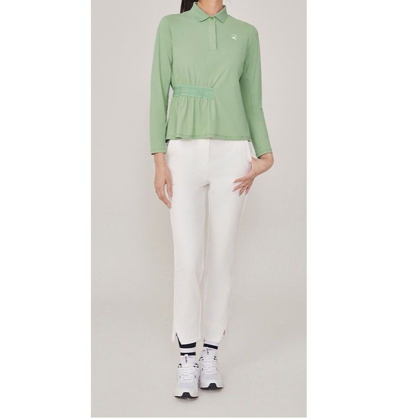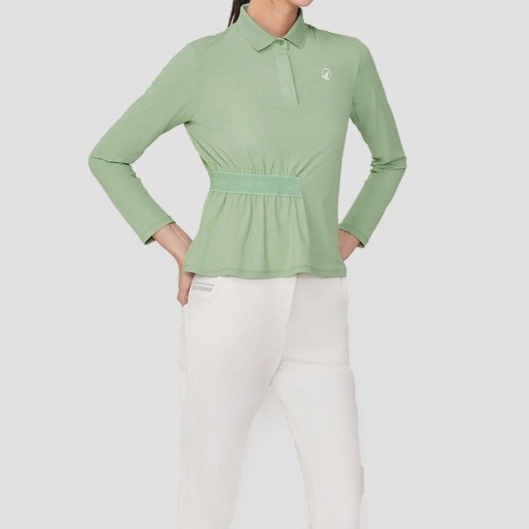 すっきりとしたシルエットが女性らしさを引き立てる長袖ポロシャツです。