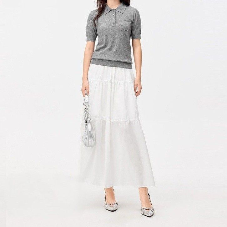 さりげない胸元のボタンが女性らしい上品さを演出し、洗練された印象をプラス
