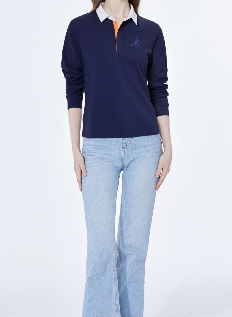 シンプルながらも洗練された印象のレディース長袖ポロシャツです。