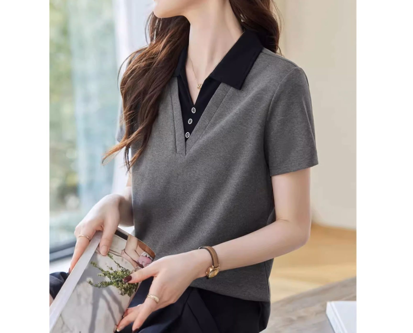 襟付きのクラシックなデザインでカジュアルすぎず、オフィスからプライベートまで幅広く活用できる