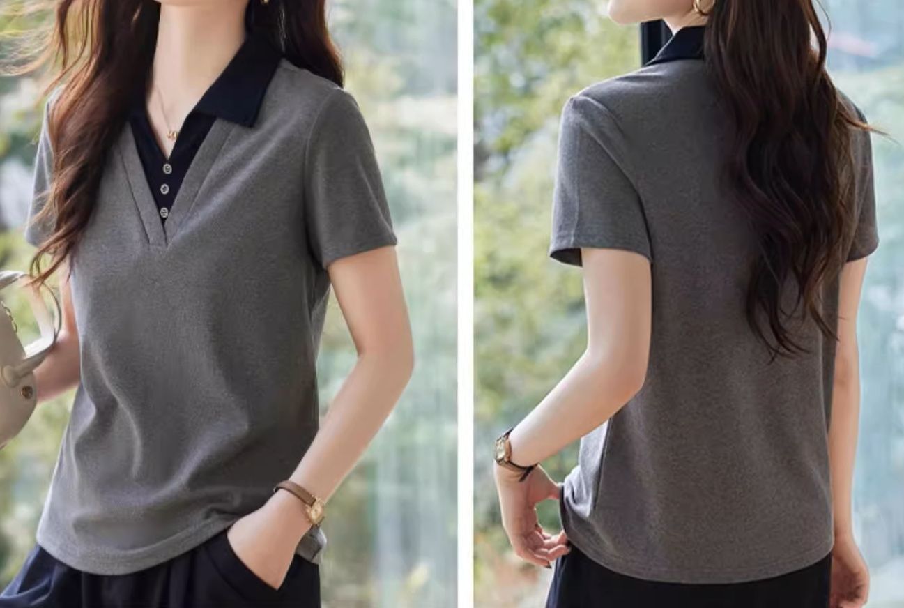 ポロシャツ レディースの定番アイテムながら、襟元のバイカラーデザインで大人の女性らしさを演出。