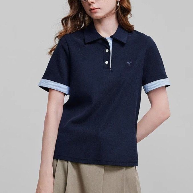 クラシックな襟付きのポロシャツスタイルで知的で洗練された印象を演出