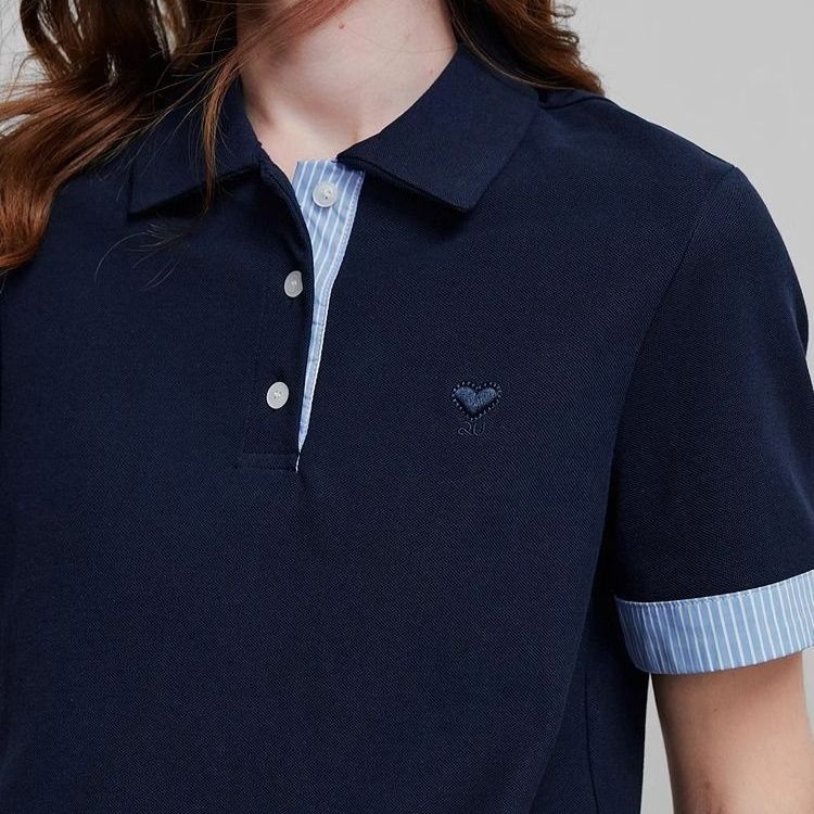 袖と衿の裏地にさりげないストライプ柄をあしらった上品なレディース ポロシャツです。