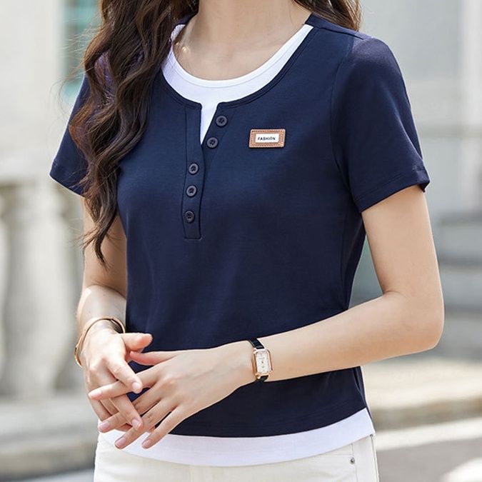 胸元の縦並びボタンが程よいポイントとなり、シンプルながらも feminine な魅力を演出