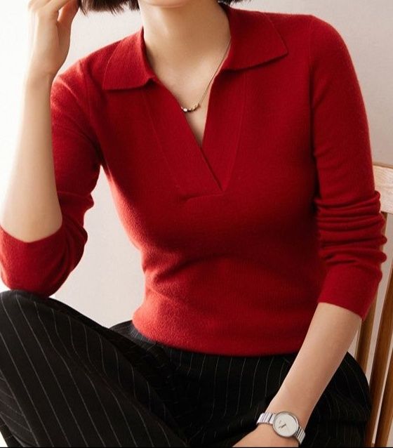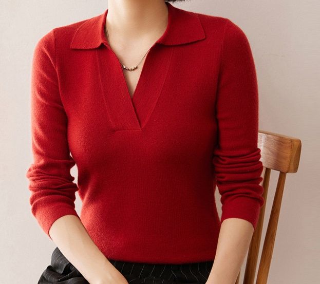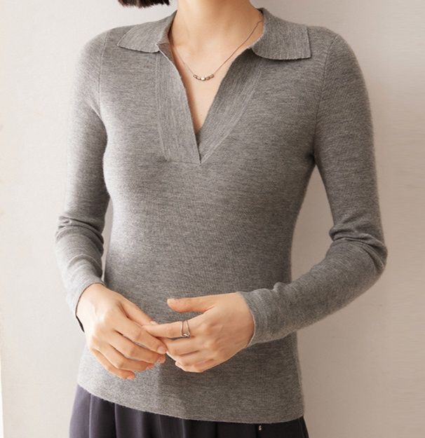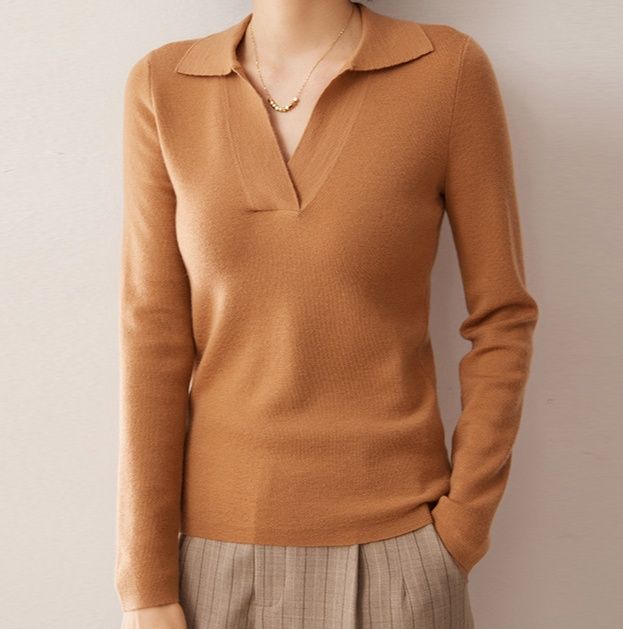 深めの襟開きとすっきりとした襟元が女性らしい印象を演出します。