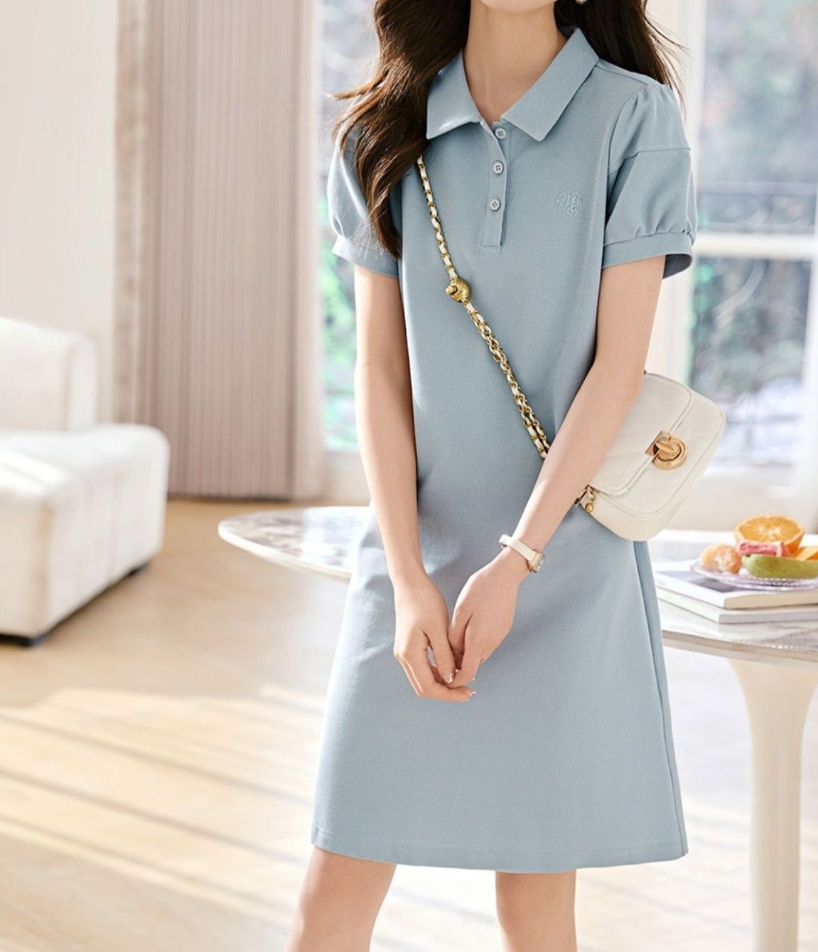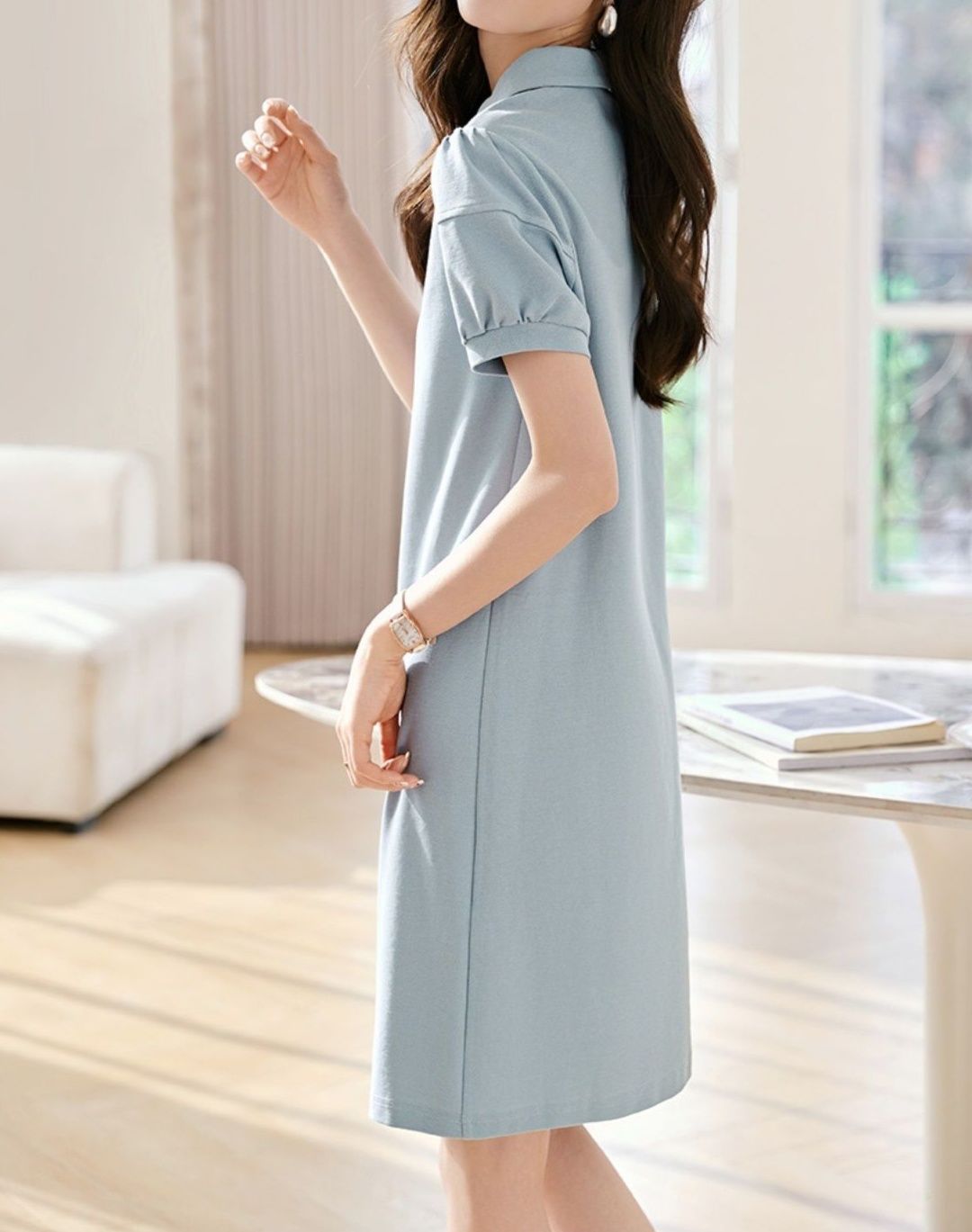 きちんと感のあるポロカラーと前ボタンで、カジュアルながらも品のある大人の印象を演出