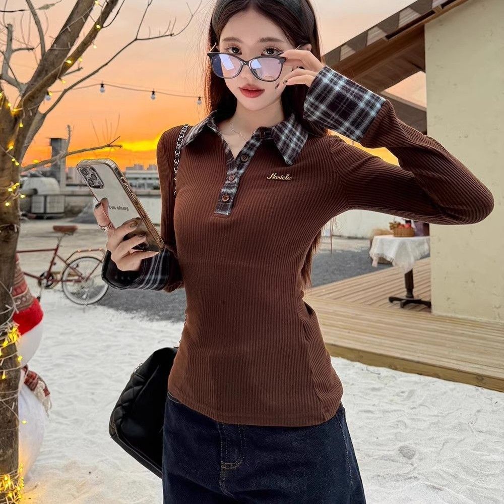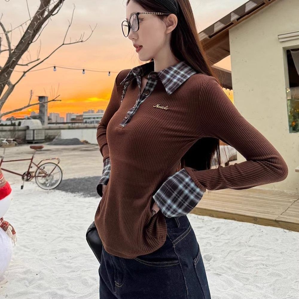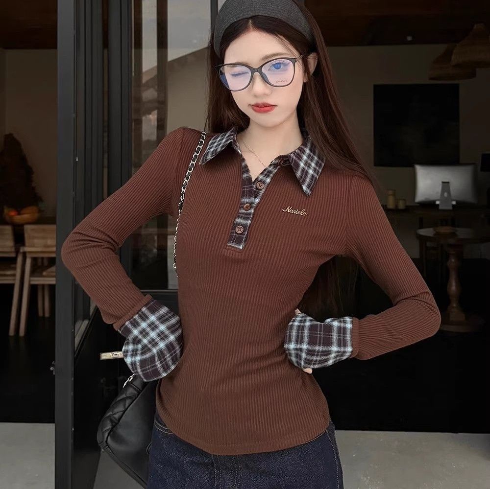 リブ編みのニット素材に、襟元と袖口にチェック柄の布地を切り替えた個性的なデザインが特徴です。