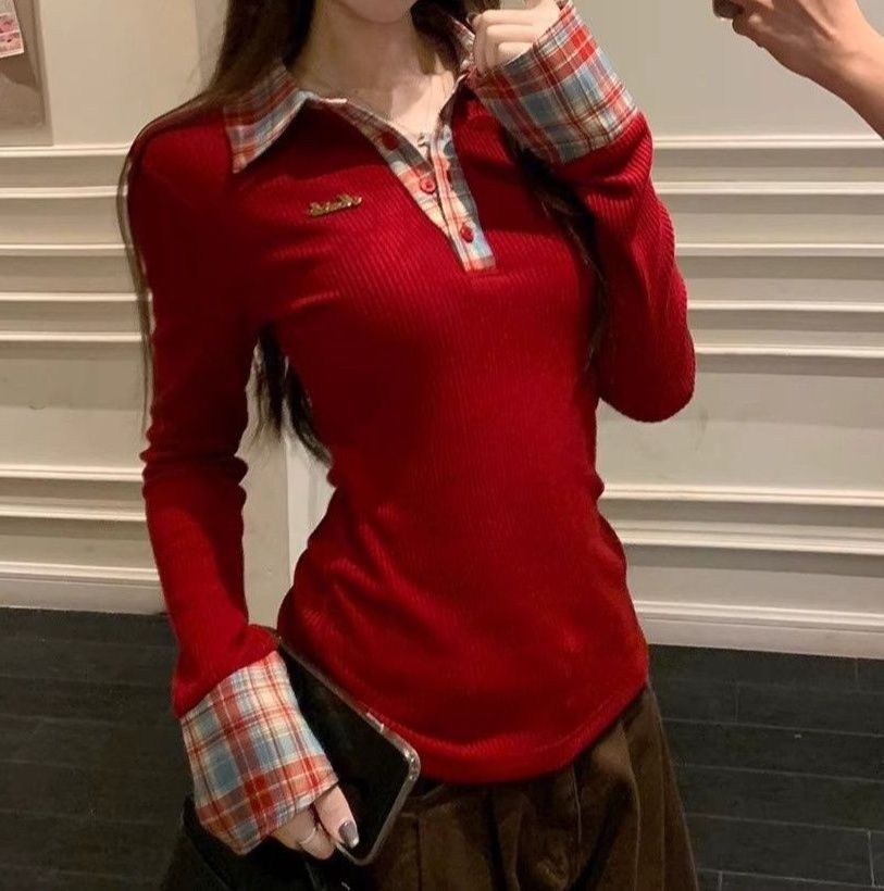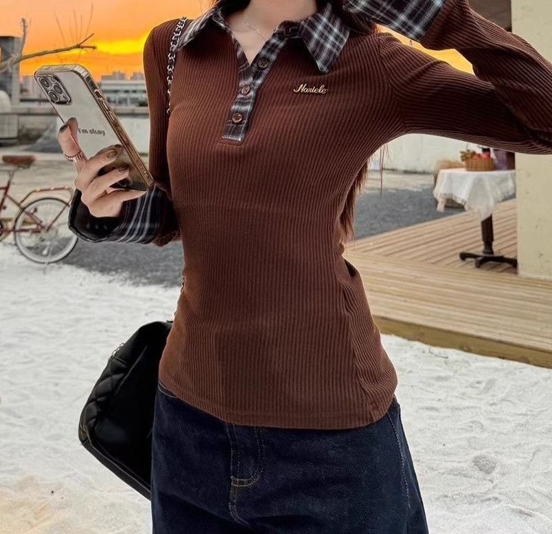 無地のニット部分にチェック柄の襟と袖口を組み合わせた重ね着風デザインで、一枚でおしゃれな印象