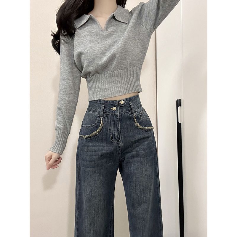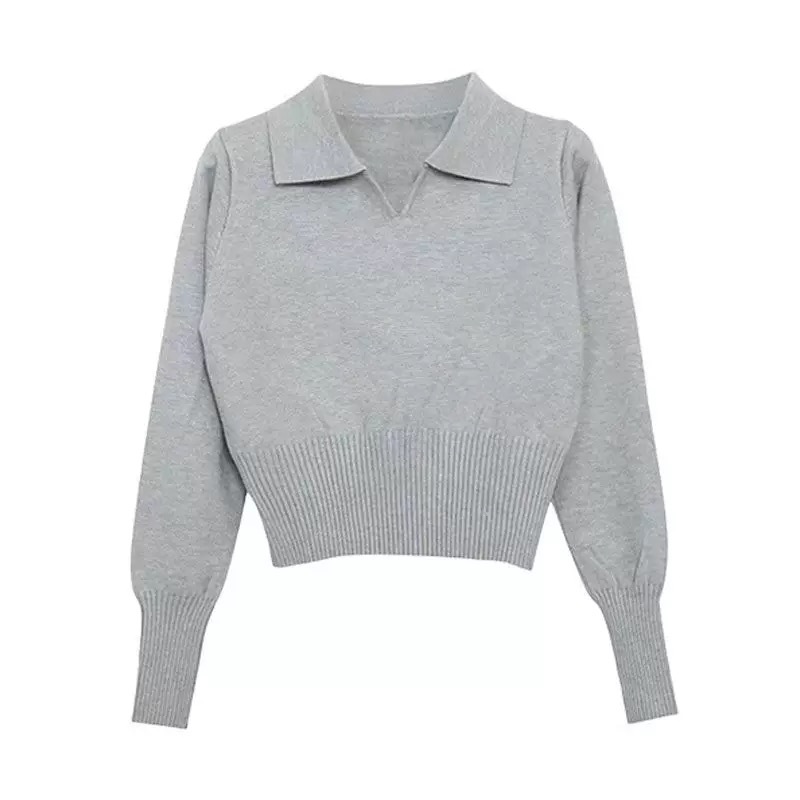 シャツライクな襟がついたデザインで、カジュアルながらもきれいめな印象を与えます。