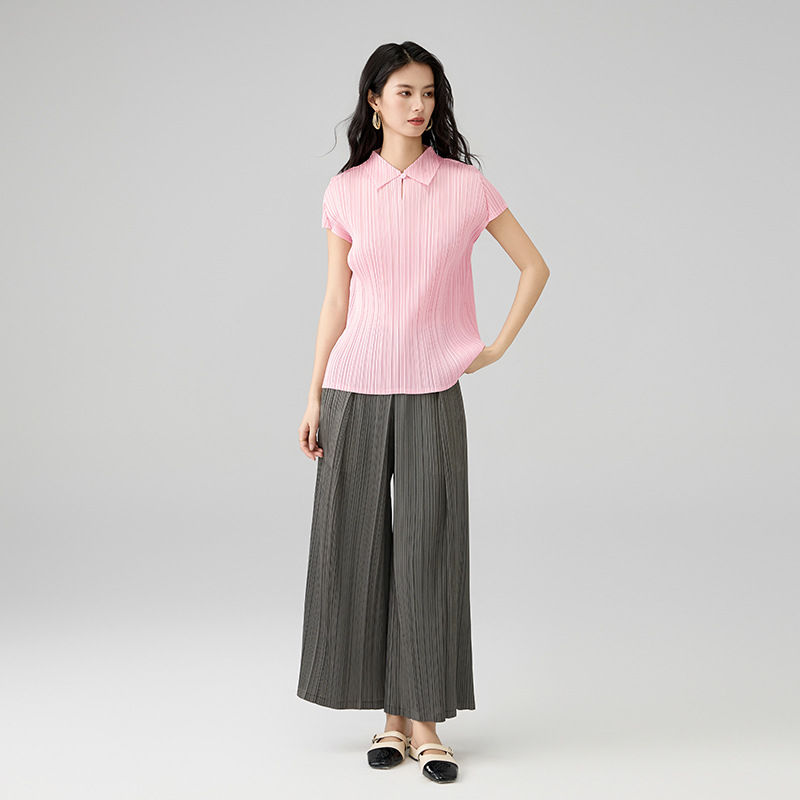 全体に施された細かなプリーツが縦のラインを強調し、すっきりとした着痩せ効果を演出します。