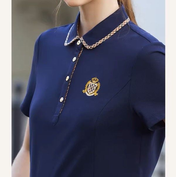 エレガントな装飾襟が特徴的な半袖ポロシャツです。