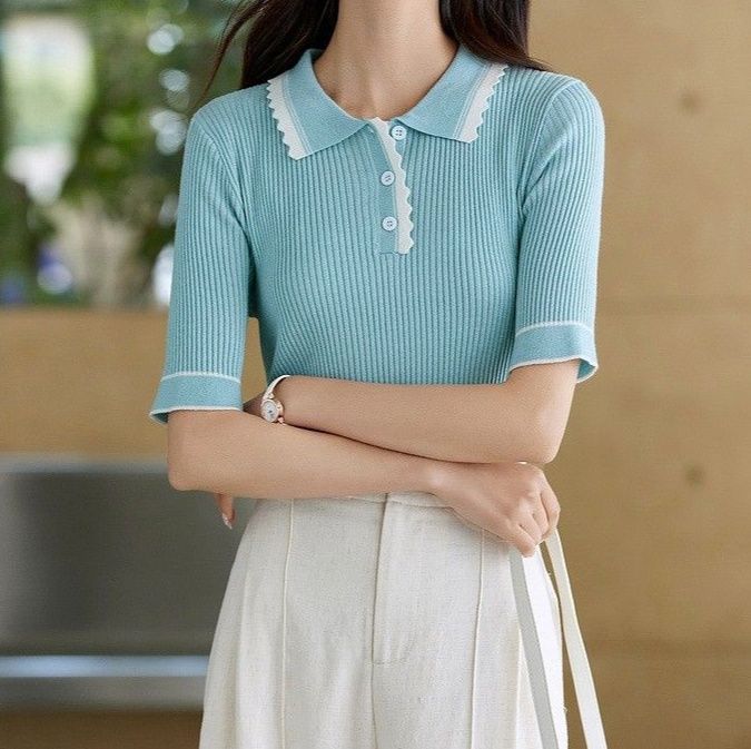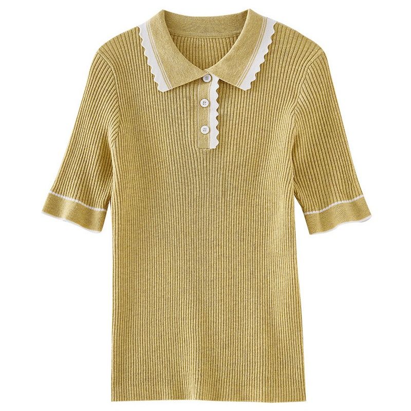 リブ編みのニット素材が上品な印象を演出するレディース ポロシャツです。