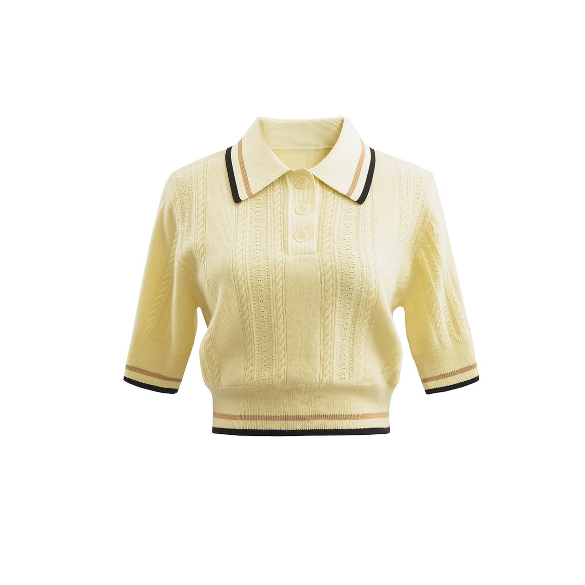縦方向に入った編み柄が上品な印象を与えるレディース ポロシャツです。