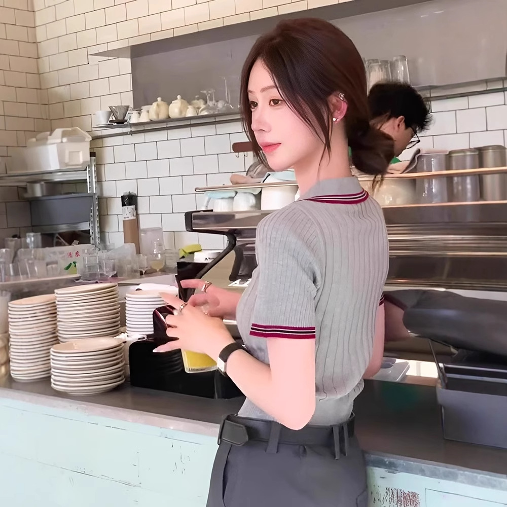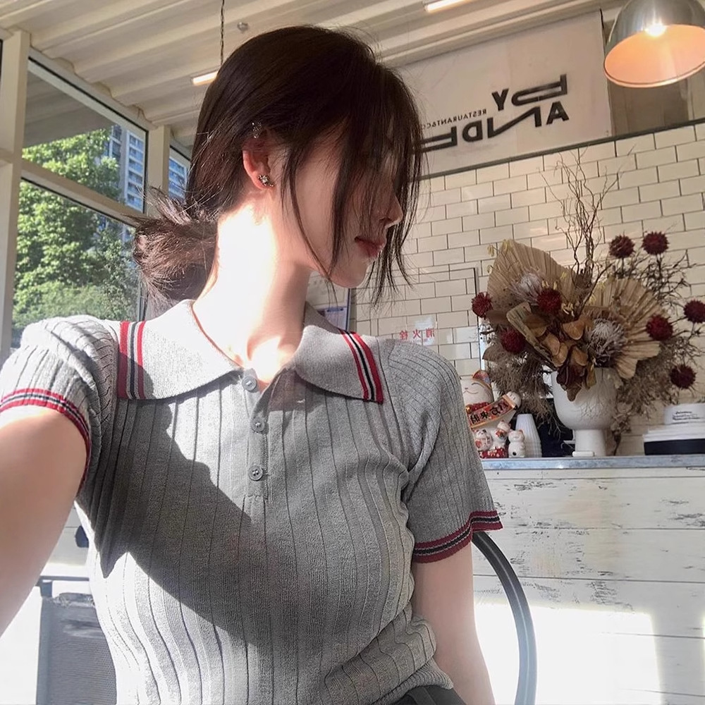 半袖の袖口と襟元に施された配色ラインがスポーティで上品なアクセントになっています。