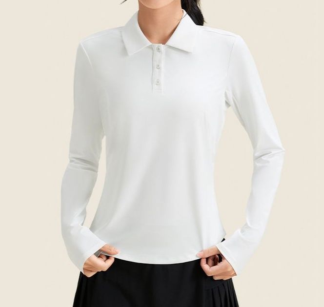 きちんとした襟付きのポロシャツスタイルで品のある大人っぽい雰囲気を演出