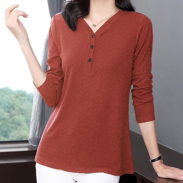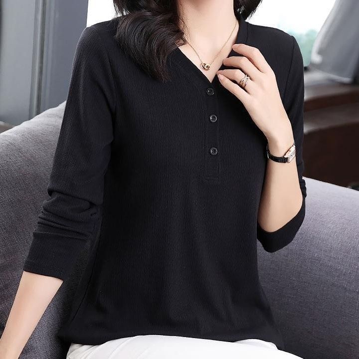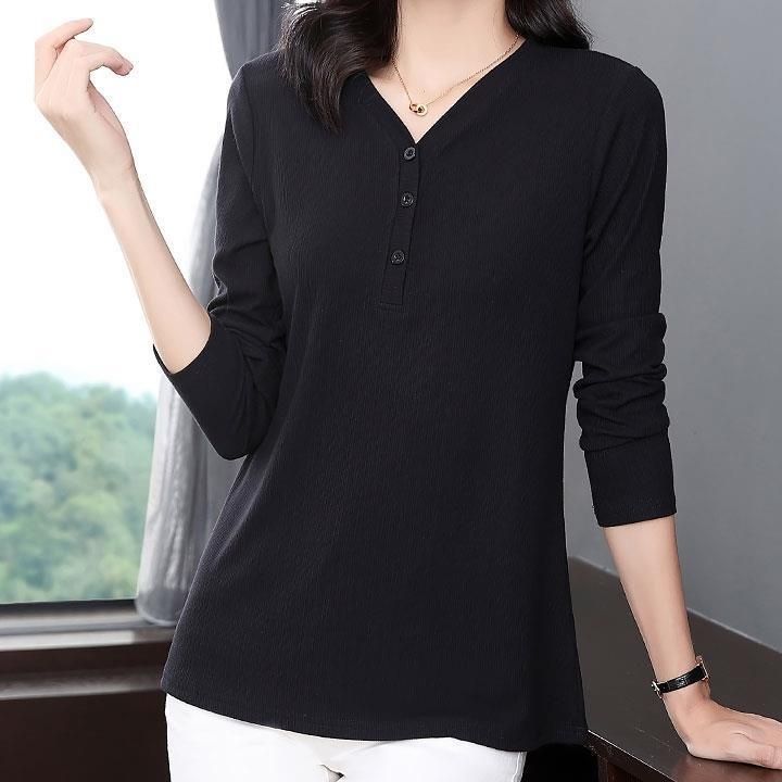 ブイネックとボタンのディテールが上品な印象を与え、程よくゆったりとしたシルエットで体型をカバーしながらも洗練された雰囲気に仕上げました。