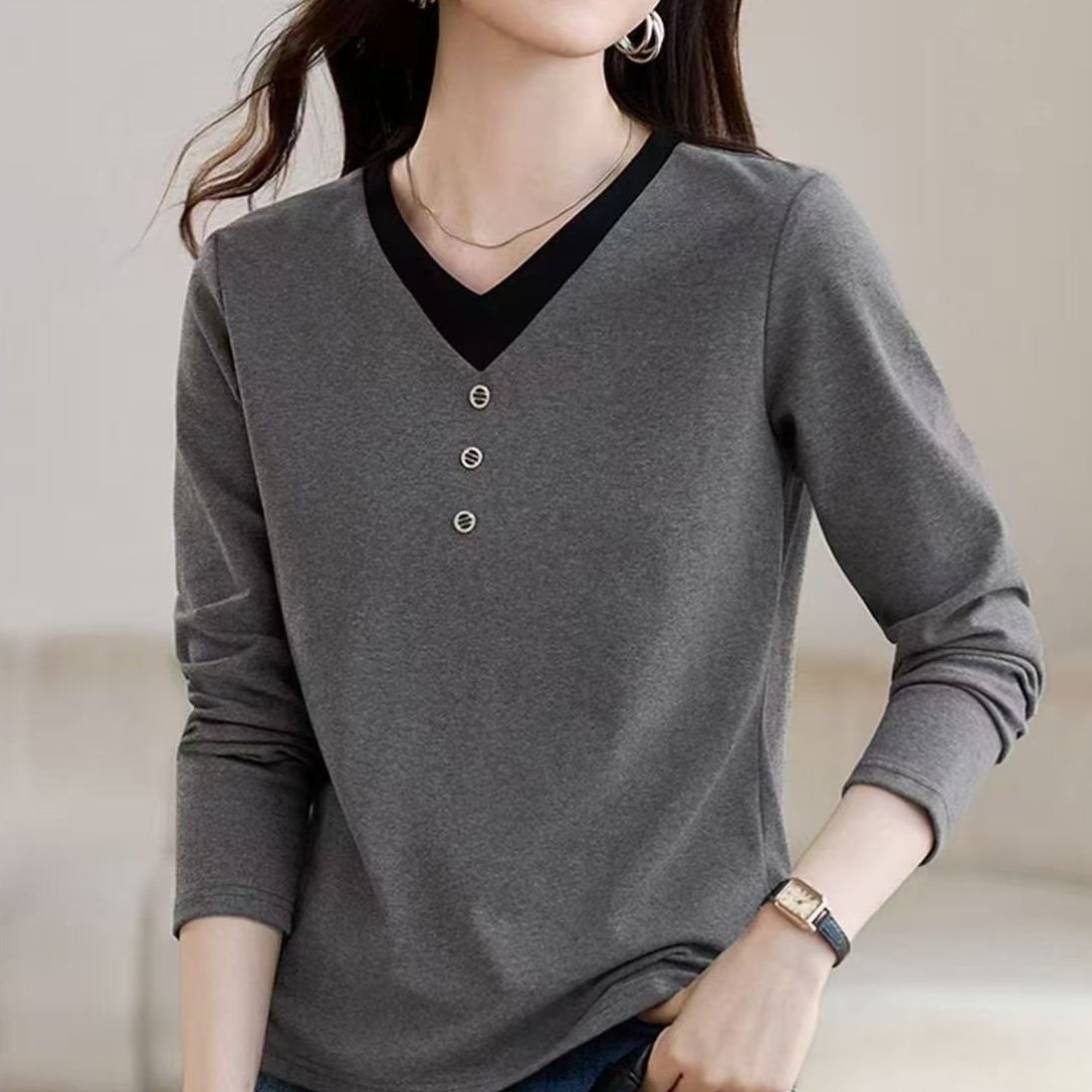 胸元のボタンがアクセントになり、カジュアルにもきれいめにも着こなせる万能な一枚です。
