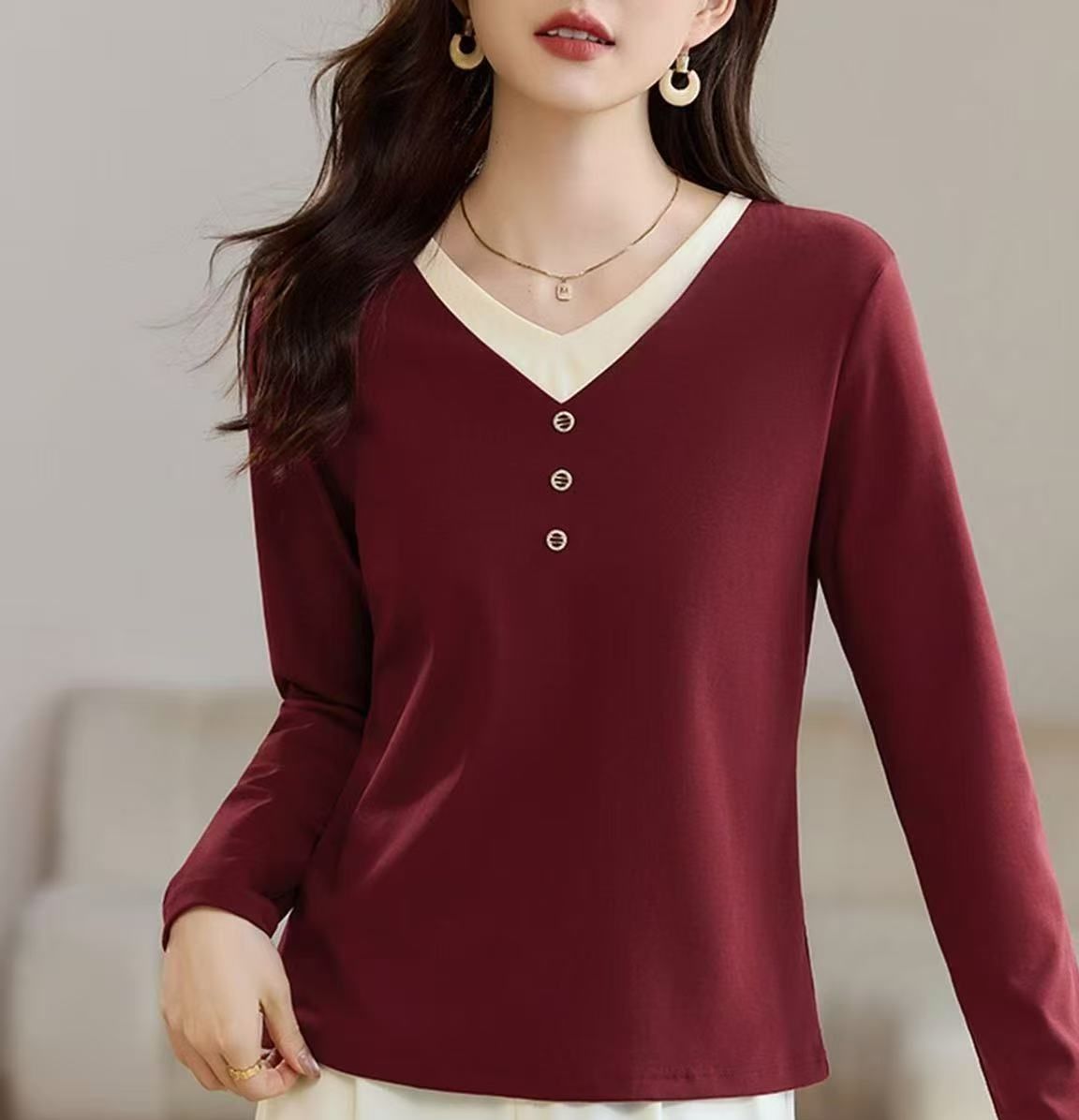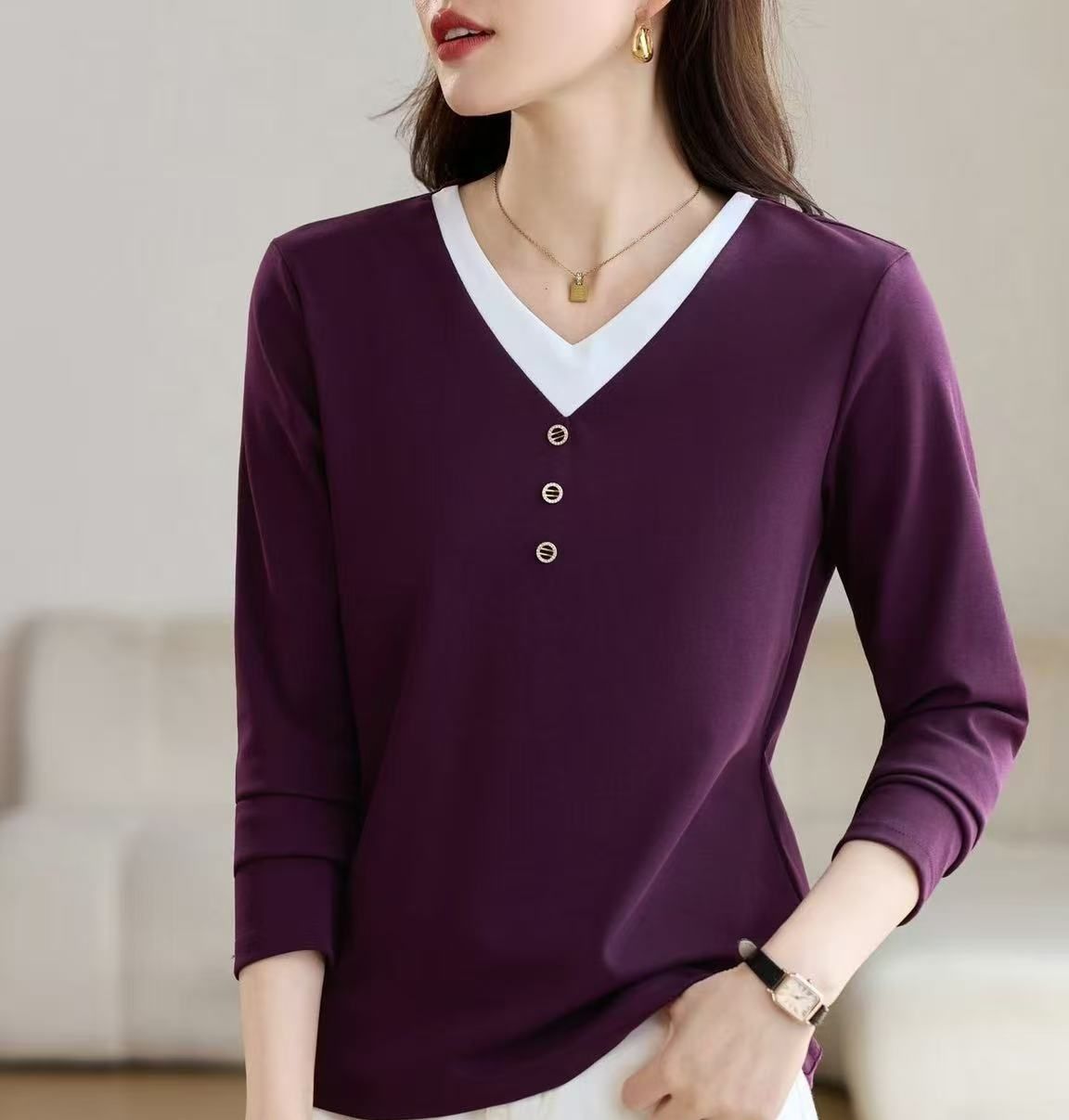 襟元の配色デザインが顔周りを華やかに演出し、さりげないおしゃれを楽しめます。