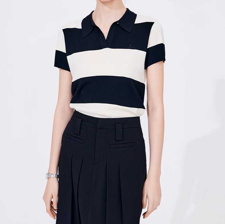 上品なボーダー柄が印象的な半袖ポロシャツです。