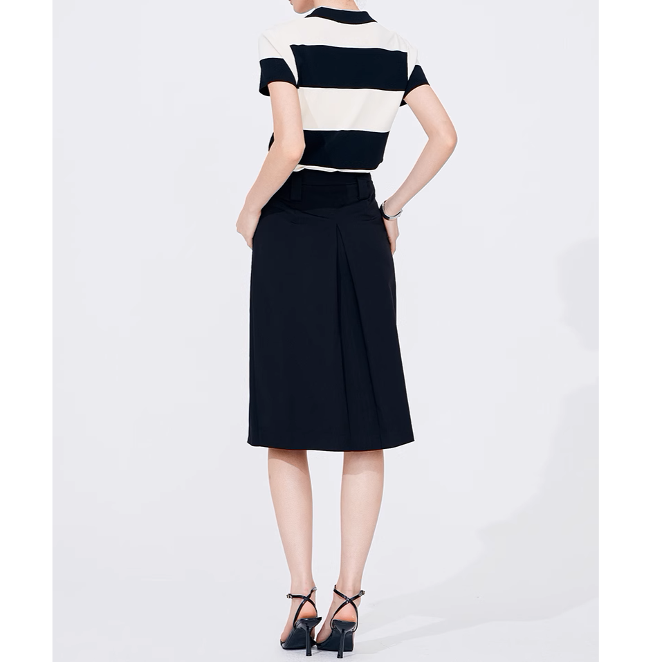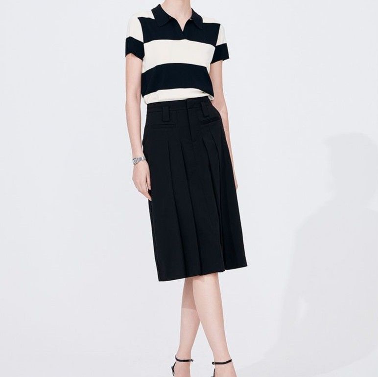太めのボーダー柄が上品で知的な雰囲気を演出し、大人らしい落ち着いた印象を与えます