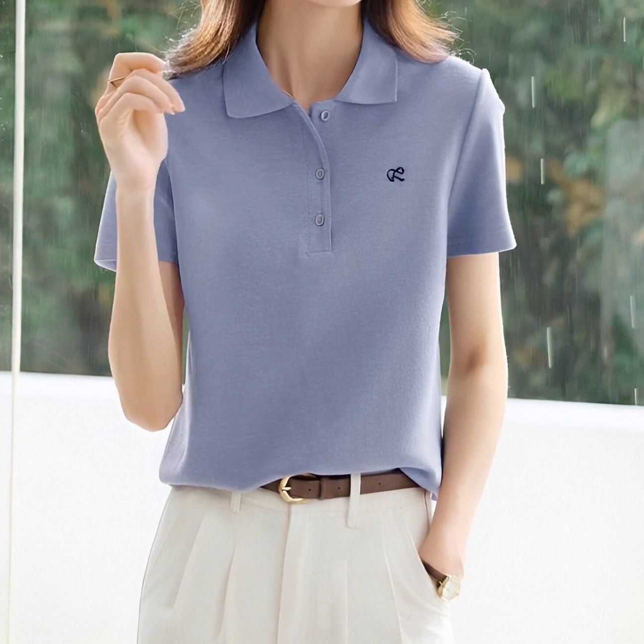 襟付きのクラシックなポロシャツスタイルで品のある大人っぽい仕上がり