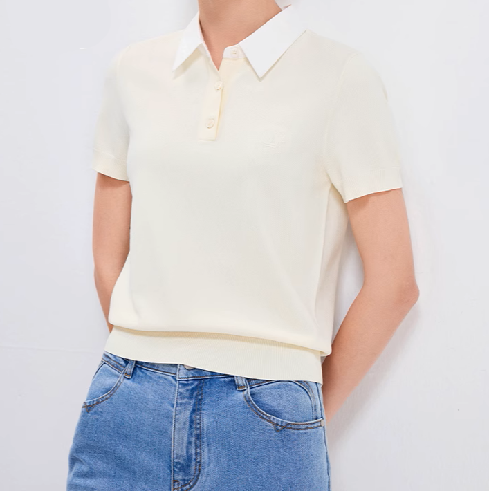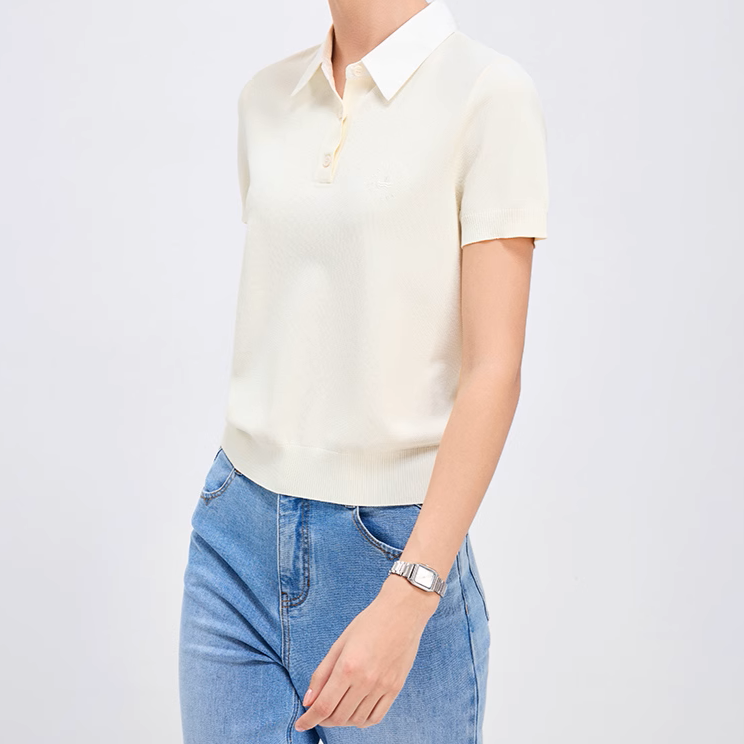 襟付きのポロシャツスタイルでカジュアルすぎず、品のあるエレガントな雰囲気を実現