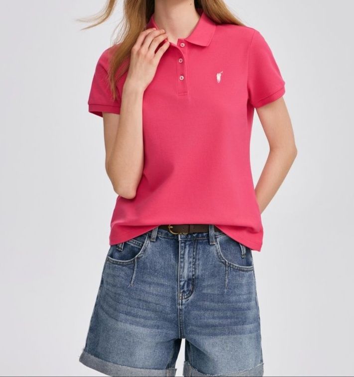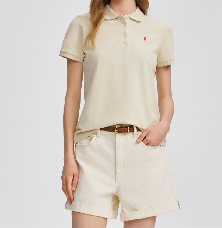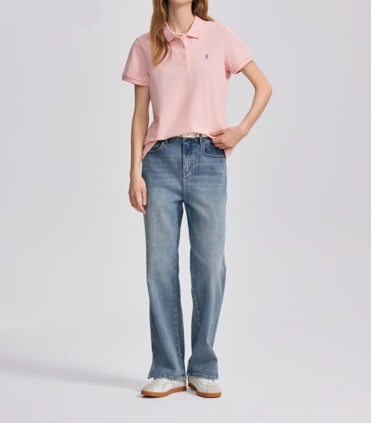 クラシックなポロ襟と前開きボタンで洗練された印象を与える定番スタイル
