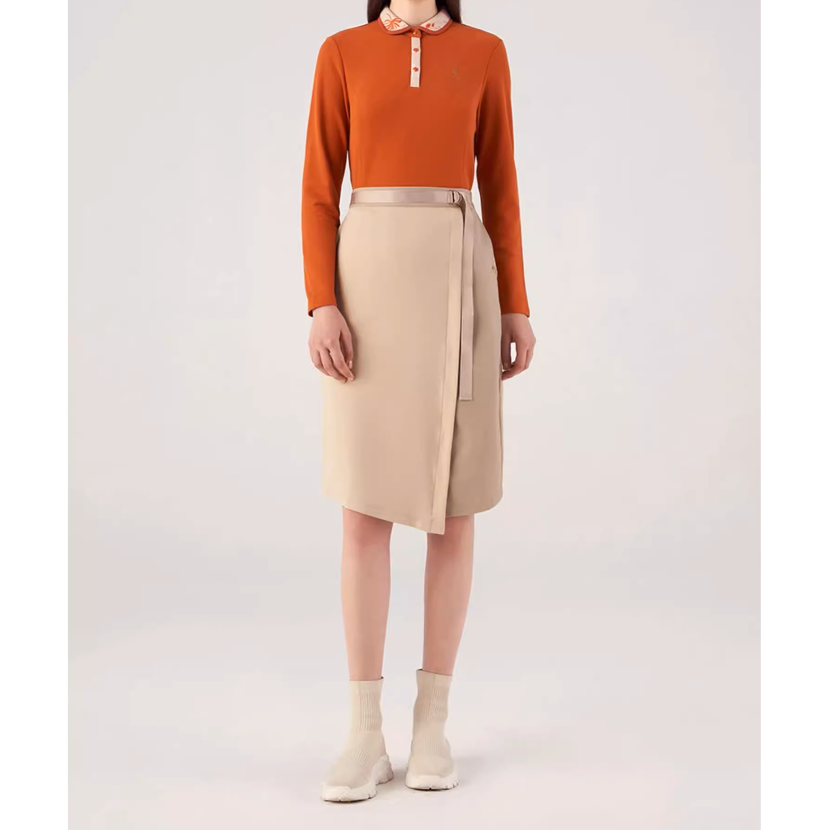 上質な綿素材を使用した長袖ポロシャツです。女性らしい柔らかなシルエットと刺繍の装飾が特徴。