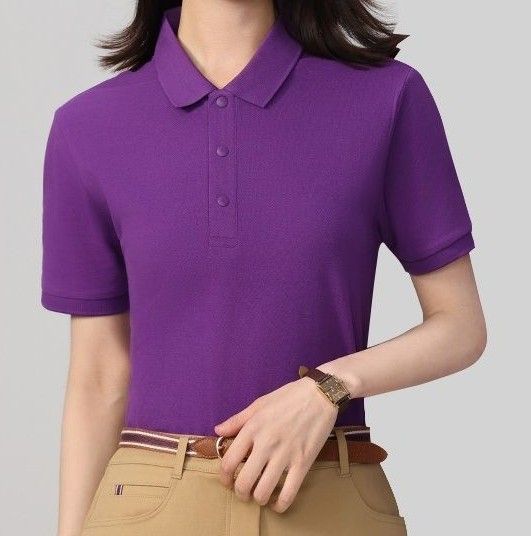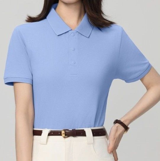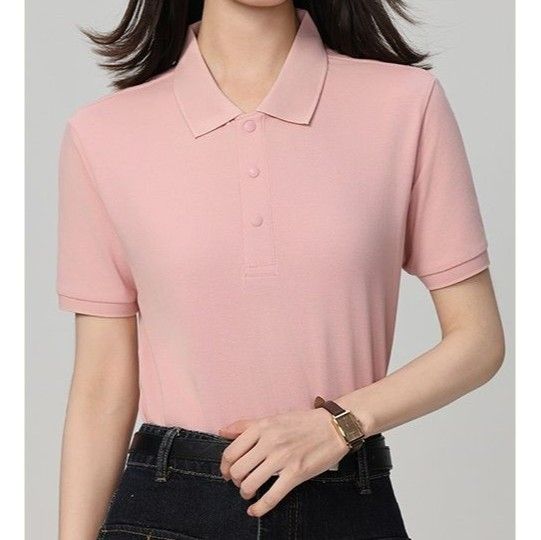 シンプルなデザインで、様々なボトムスと合わせやすいレディースポロシャツです。